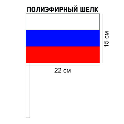 Флаг 15*22 см, материал полиэфирный шелк, обработка горячий рез по периметру, по левой короткой стороне карман 5мм, в комплекте древко белое пластиковое диаметром 5мм, длина 30см