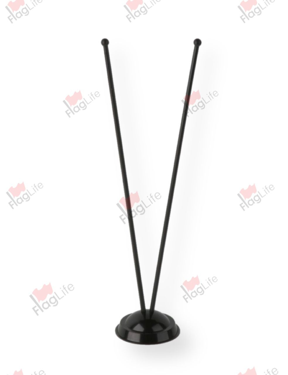 Подставка на два флага черная. Высота штока 315 мм; - диаметр штока 5 мм; - диаметр основания 60 мм. Пластик белого или черного цвета. Наконечник штока пика или шарик.