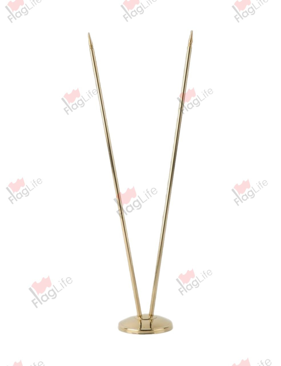 Подставка на два флага металл латунь золото. Высота штока 315, 350, 400 мм; - диаметр штока 5 мм; - диаметр основания 60 мм. Наконечник штока - пика.