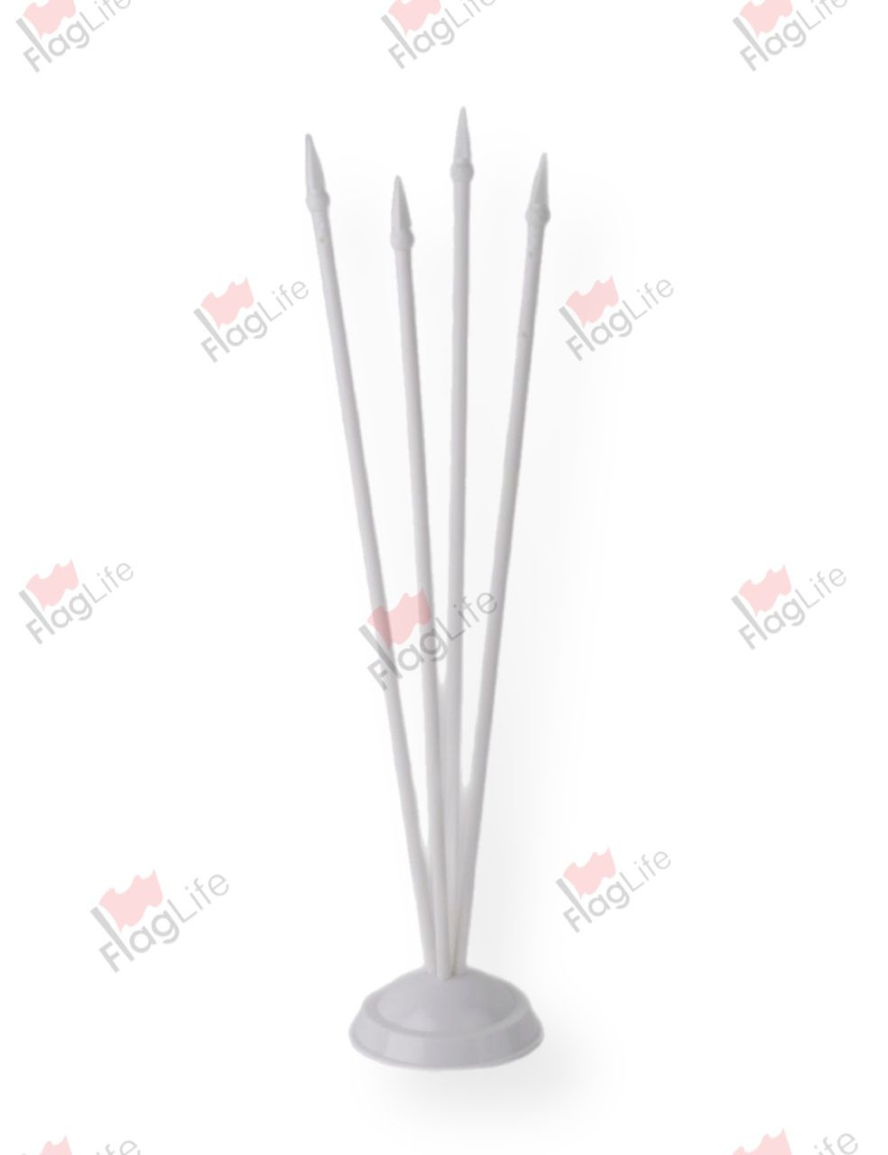 Подставка на четыре флага белая. Высота штока 315 мм; - диаметр штока 5 мм; - диаметр основания 60 мм. Пластик белого или черного цвета. Наконечник штока пика или шарик.