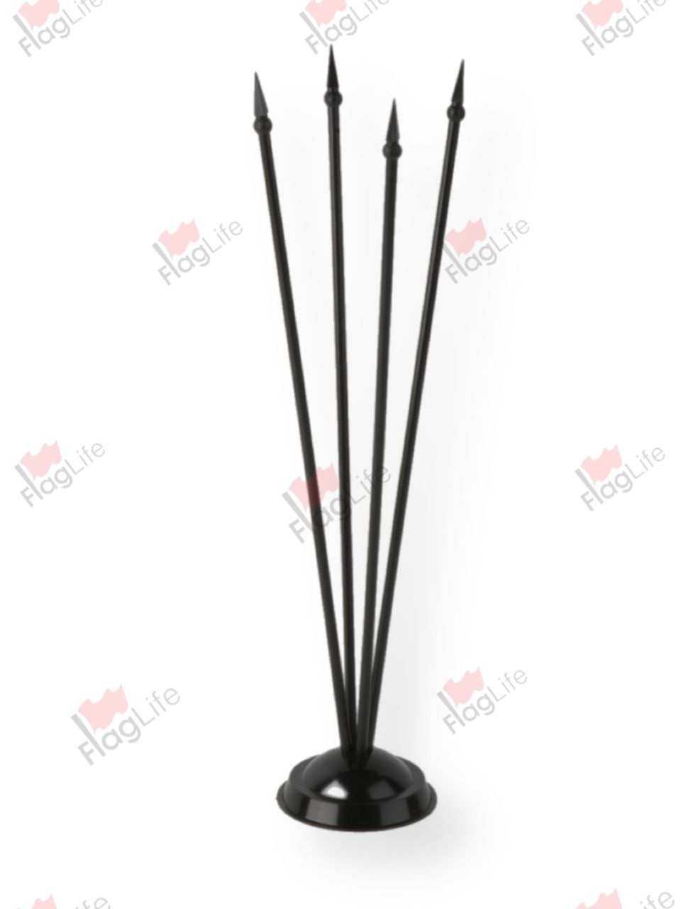 Подставка на четыре флага черная. Высота штока 315 мм; - диаметр штока 5 мм; - диаметр основания 60 мм. Пластик белого или черного цвета. Наконечник штока пика или шарик.