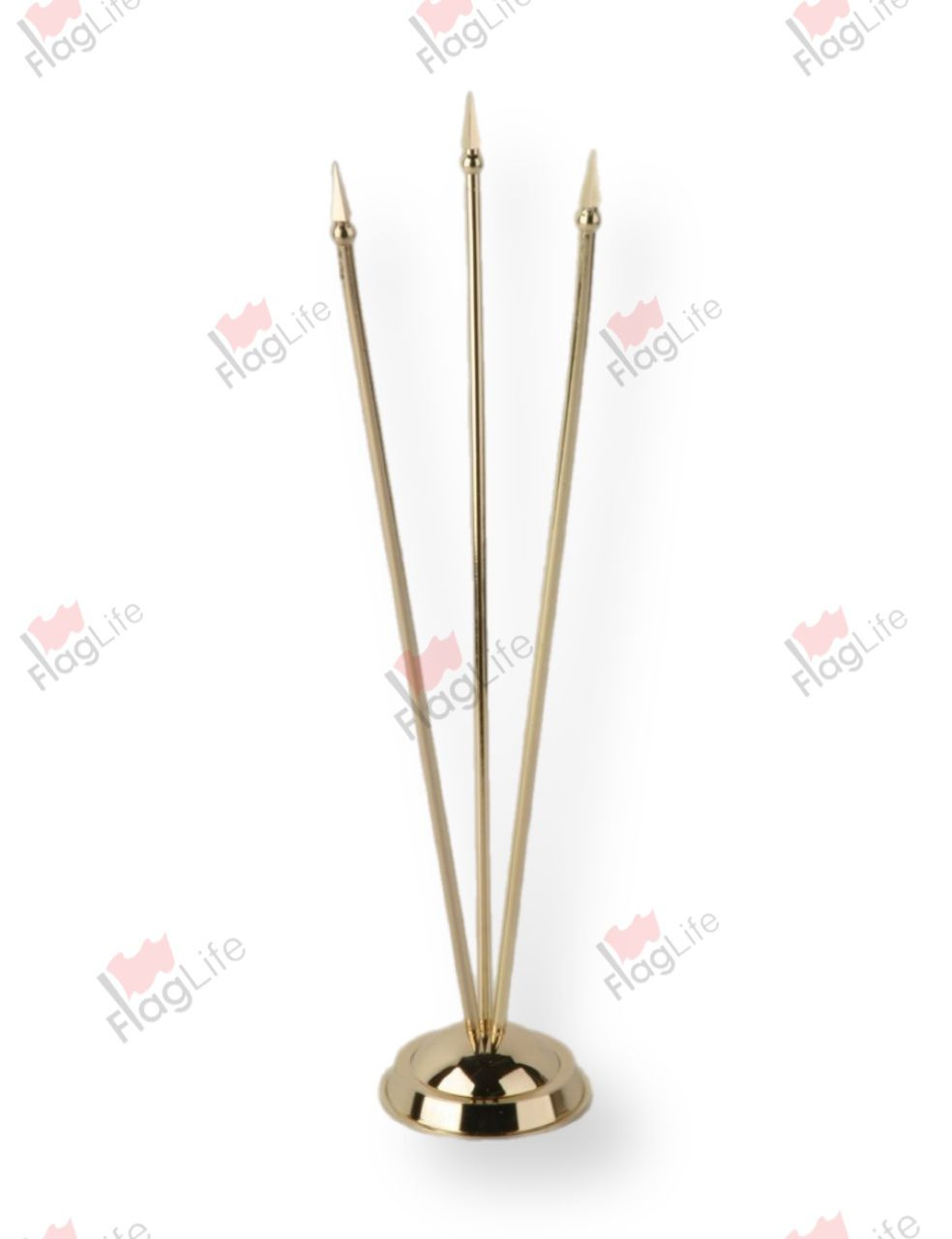 Подставка на три флага золото. Высота штока 315 мм; - диаметр штока 5 мм; - диаметр основания 60 мм. Цвет серебро или золото. Наконечник штока пика или шарик.