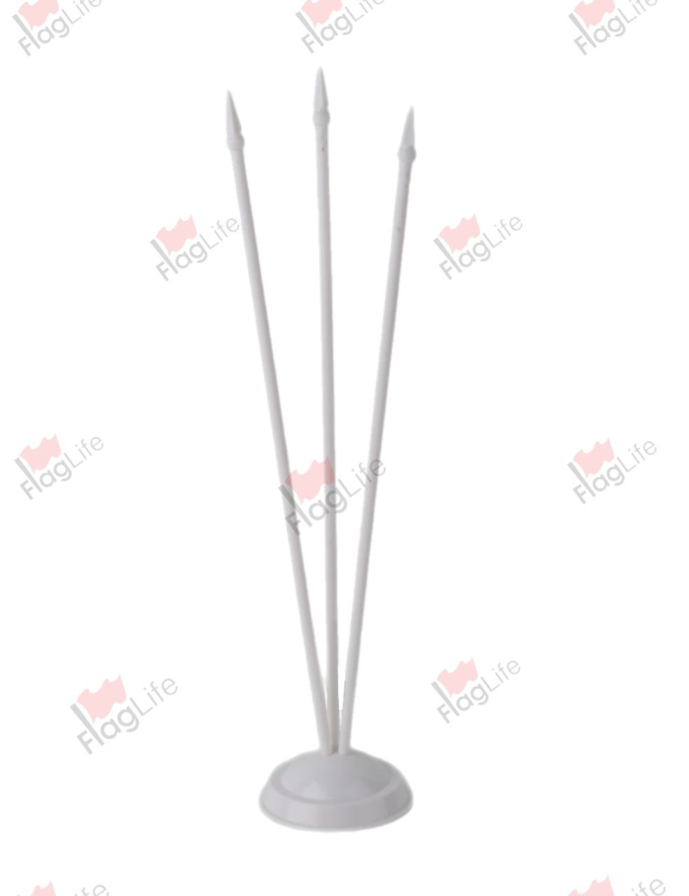 Подставка на три флага белая. Высота штока 315 мм; - диаметр штока 5 мм; - диаметр основания 60 мм. Пластик белого или черного цвета. Наконечник штока пика или шарик.
